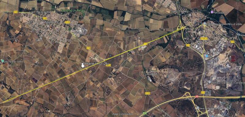 Ici, la Via Domitia est rigoureusement rectiligne sur pratiquement toute la portion entre les milliaires XXXIII (33) et XXXVIII (38).